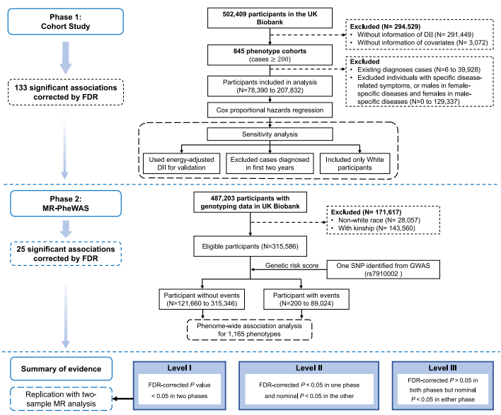 该研究基于英国生物样本库数据,利用29种食物成分计算DII评分。随后,采用Cox比例风险回归模型评估DII在不同疾病表型队列中与健康结局的关联。为进一步探讨DII与健康结局之间的因果关系,该研究在140,669名个体中开展了DII的全基因组关联研究(genome-wide association study,GWAS),并据此开展全表型孟德尔随机化研究,以系统分析遗传预测的DII与健康结局的关系。基于上述分析结果,该研究对DII与健康结局的关联进行证据分级,并通过双样本孟德尔随机化进一步验证。